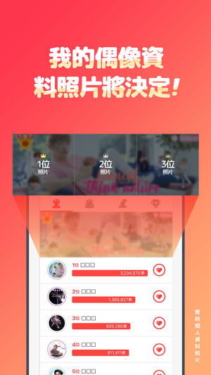 #. 韩国100万人热衷的“최애돌”的国际编辑! #. 将您的宝宝打造成捐赠天使、捐赠英雄 #. 如果获得第一名,以偶像的名义捐赠! *手機偶像粉絲打榜服務最愛偶像正在瘋狂流行! [喜歡偶像就在最愛偶像!] - 和您的最愛偶像共享照片,贈送充滿愛的愛之心,您可以見到相同最愛偶像的朋友們! [爲了第1名的愛之心投票!] *偶像的排名取決於從社區所有文章獲取的愛之心與查看排名中投票的愛之心的合計! [簡曆照片我來決定!] *各偶像的簡曆照片爲社區獲得最多愛之心的留言的照片! [偶像日程] *在相同的粉丝之间分享日程! [名譽的名譽殿堂!] *每天獲取最多愛之心的組與個人將登上名…