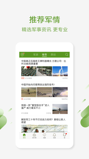 【产品特色】 - 聚焦军情:为您聚焦全球热点军事资讯;重大、突发新闻推送,秒发到您手中 - 评论互动:看军迷爆评,与千万战友一起评论时事 - 作战任务:简单签到、分享等任务获取军功、军饷,升级到元帅,统帅您的专属部队 - 原创视频:集各种分类视频于一身,让您随时随地享看不停。 - 兑换中心:军饷有去处、兑换您心仪的物品吧。 - 虎视频 :迷彩虎推出的一档军事科普,轻松搞笑、常识类的短小视频,力求展现精华内容。 【意见反馈】 -软件反馈:我的-帮助与反馈 -官方网站:http://www.micaihu.cn -微信公众号:micaihu666