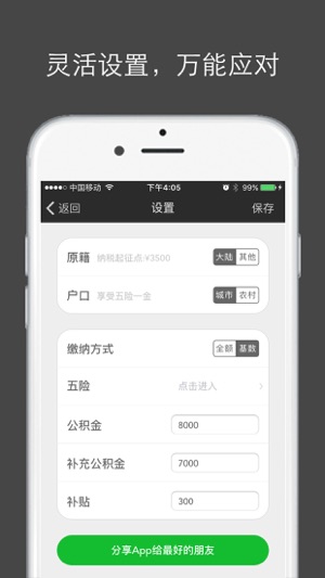反馈QQ群:471510540、471474185 如果你是一个面试者: -您还在为面试中谈薪而疑虑吗? -您还在为算不清月薪中的五险一金而烦恼吗? -您还在为年终奖纳税而摸不清头脑吗? 本App提供根据月薪分析五险一金,纳税的完整服务,快速计算您想在面试谈薪时,想知道的一切。 勇敢面试,薪算有我。 如果你是一个HR: -您还在为面试者提出的月薪后,计算不出公司年成本苦恼吗? -您还在为各种缴纳基数和缴纳比例而抓狂吗? -您还在为三险和五险而头脑风暴吗? 本App提供各种设置,动态切换三险与五险,灵活配置各种缴纳基数、缴纳比例。快速计算公司为员工付出的年成本。