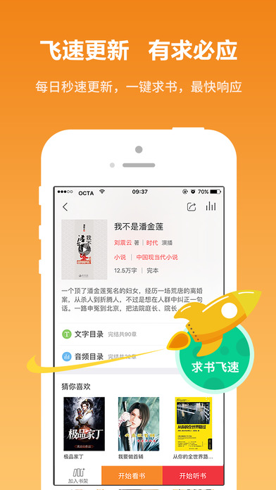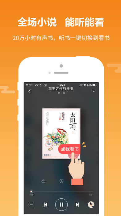 1.全方位听书看书专用神器,专注网络小说。 2.300万册精品图书,每周2000+新书上架,男频女频应有尽有,图书免费畅读。 3.海量小说,超省流量,无广告零收费,不嫌下载,绿色清新无广告,广大书友的理想选择。 【0元畅读】无论小众大众,冷门热门,小资简约,你想要的书籍免费阅读,无限量下载。 【明星播读】一键切换听书模式,多个主播读给你听,杠杆滴音质媲美CD; 【高清设置】护眼模式、仿真等多翻页效果、自定义阅读设置,统统帮你搞定; 【极简印象】全新卡片式极简时尚二次元设计,多样化排版,百看不厌; 【更新提醒】关注的书籍实时更新,热乎乎的提示立即飞到你手上; 【绿色无广告】纯粹阅读体验,拒绝磨人广告,从头至尾流畅体验 【应用尽有】 1.畅销:琅琊榜、大主宰、我欲封天、天域苍穹、择天记、校花贴身高手、魔天记、雪鹰领主、雪中悍刀行、盗墓笔记、太子妃、寂寞空庭春欲晚... 2.大神:辰东、我吃西红柿、唐家三少、匪我思存、桐华、辛夷坞....