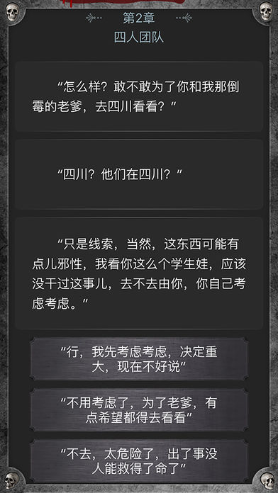 一张神秘地图,一个百年诅咒,引起一场四人小队惊心动魄的探墓之旅。百鬼地宫,千佛之窟,幻海地陵……无数次惊心动魄的冒险,无数次死里逃生的考验,依靠着神秘黑袍人的守护,四人从草包到高手的蜕变中渐渐成长…… 然而……他竟成了幕后黑手的头号嫌疑人?! 凡是真相,终会揭开... ** 完成任何一种结局后,您便可以返回故事已发生的任意位置重新开始。看看如果做出不同的选择,会发生什么事?看似简单的选择,会产生对主人公命运的影响。 ** --颠覆传统的阅读模式,融合小说,游戏双重特色。谁说故事只能有一个结局?-- --隔壁大书官方重磅推荐,引领互动小说次世代。-- ** 制作工具:隔壁大书互动小说编辑器 授权与发行:大书网 作者:乔歌 QQ群:555344812 官方网址:www.wanshuwang.net 隔壁大书,互动小说次世代。每一部作品都是大书作者的精心之作,武侠,言情,玄幻,恐怖题材丰富,风格多样。想制作属于你自己的大书游戏吗?来官网下载制作工具吧, 只要有脑洞,就有机会成为签约作者。作者火热招募中!!!亲,来约哦~