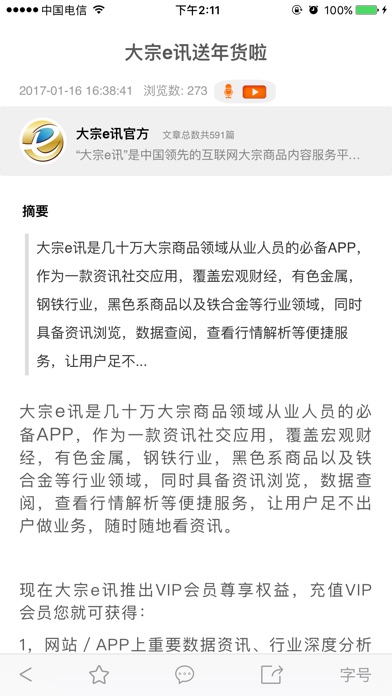 概况 大宗e讯不仅为用户及时提供大宗商品资讯、数据、策略、和线上贸易撮合服务,更让用户可以直接参与发布行业资讯和商品供求,简单、快速、直接、专业让每个行业内的客户参与其中,收益其中,平台还为行业内客户提供船运供求信息旨在从物流方面帮助平台用户,我们关心大宗商品行业内的每一个细节。 特点 平台通过同名App、网站、微信公众号和微博为行业用户提供服务。每天推送的资讯内容快速、真实、准确,并提供专业、自由的交易模式,整合行业内的客户资源和数据,为行业内各方提供最专业的一站式平台服务。创新的大宗行业加上互联网模式,您不仅是任何资讯数据的获得者,更可以直接成为发布者,与他人分享,实现资源互补。 主要功能 1,网罗大宗商品最新资讯 国内外的大宗商品资讯一网打尽,更是细分到各个产品(镍、锡、铜、铝等等),多达17种,致力打造最新、最快、最详细的大宗资讯,提供您阅读 2,订阅“作家” 大宗e讯“订阅”,聚集了一批拥有丰富经验以及独到眼光的编辑作家,提供个性化的阅读服务 3,资讯随时发 如果您也有相关内容想要发布,大宗e讯给您提供最好的平台,把您看到的、知道的,随时拿出手机写下或拍下,与业内人士一起分享及探讨
