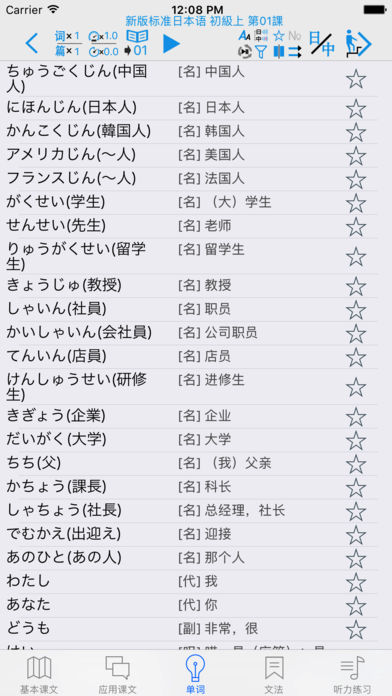 使用大家日语数据的用户请通过微信联系我们(3104477509)。 本APP为日语辅助用的学习软件。主要包含了生词表,课文,语法及部分听力练习(根据数据不同有所变动)。课文,生词,听力部分都配有真人发声。您可以通过手机和平板进行下载。方便任何有需要的朋友方便快捷的学习,快速强化您的听,说,读,写能力。本APP集成了超强的复读及语音变速功能,可以根据自己的需要对每个单词、每句话或者整篇内容进行一遍或多遍的复读,洗脑式的复读可以加强记忆。同时,您还可以在“设置”里进行设置后台播放,方便您在移动中使用。 语音复读模块: 在会话,课文和单词部分中,除了手工点击可以播放外,还集成了超强的复读功能。具体包括: ① 通过词[句]([词])按钮【左2】 调整 一句话/单词 的 单次复读次数(最大为99次)。 ② 在①的功能基础上,还可以通过[篇]按钮【左3】来调整整篇的复读次数(最大99次)。 在和①的功能组合使用的时候,一句话/一个词 最大可以复听(99x99)次。 ③ [音速]按钮【左4】用来调节发音的速度(0.5~2.0),帮助您找到适合自己的语速。逐渐的加强听力。 用来调节发音后的等待时间,(0.1~10),您可以在设置中设置适合自己的默认发声的速度。) ④ [等待]按钮【左5】置适合自己的默认发声的速度。)使用该功能可以方便您进行听写和跟随朗读。同时该功能也配合[句,词]功能进行多次跟读。 (您可以在设置中设置等待时间的单位(单词发音长度单位或时间秒单位)。) ⑤[范围]按钮【左6】用来调节复读的范围,通过该功能可以实现多课连续朗读。该功能可和上述①、②、③的功能同时使用,让您最大限度的使用复读功能。连课范围是:进入的课开始,选择的连课结束。例如:复读3-16课:第3课进入,选择16,点击播放即可。 ⑥ 如果在设置中打开后台播放功能(默认打开),就可以让您设置的复读声音进行后台播放。您可以通过耳机的线控进行停止/继续,在有在连课的时候,更能通过线控进行切课。(单击2次换下一课,单击3次换前一课,单击一次播放/暂停。) ⑦ 按钮 [▶]/[■]【左7】进入复读开始/停止。 文型,例文,会话: ①为方便初学者,本APP为文章中的每个汉字加上了注音,您可以通过[ひらかな]按钮进行显示或隐藏的切换。 ② 显示切换:您根据自己的需求,通过工具栏上的[日/中/日中]的按钮进行中文,日文的显示/隐藏的切换。 单词部分: ① 显示切换:您根据自己的需求,通过工具栏上的[日/中/日中]的按钮进行中文,日文的显示/隐藏的切换。 ② 收藏模块:您可以通过每个单词右边的[星号]按钮,对单词进行收藏。并通过顶部的[星号]按钮,对收藏的单词进行过滤显示。 ③序号显示:可通序号显示按钮进行序号显示临时切换。 ④分列显示:更改屏幕的单词显示方式(上下显示,左右显示)。 ⑤乱序显示:更改屏幕单词的显示顺序。(支持复读) ⑥单词过滤:通过过滤按钮可以进行显示范围的调整。 ⑦练习模块:通过顶部的[练习]按钮,您可以切换到单词的练习模块。本APP集成了“中文->日文”、”日文->中文“、”中文->语音”,“听说比对” ,“单词拼写”等(以下)五个练习模块。(※ 1,※ 2,※ 3) a. “中文->日文”练习:根据中文内容选择相应的日文。 b. “日文->中文”练习:根据日文内容选择相应的中文。 c. “语音->中文”练习:根据听到的声音选择相应的中文。 d. “听说比对” 练习:通过录音,及回放比对您的发音和标准发音。 e. “单词拼写” 练习:通过提示的中文,通过键盘(kana或罗马字)拼写出假名。 ※1 练习模块可和收藏模块进行配合时,可对自己选定(收藏)的单词进行练习。 ※2 练习模块可和范围模块进行配合时,可对特定范围进行练习(例如:第一课进去,选择连课16课的时候,练习范围就是1-16课的单词)。 ※3 练习模块可同时配合收藏,连课2个模块一起使用。 语法解释: 收纳了课本中的语法解释部分的所有语法及例句。 其他: ◎你可以通过左右滑动进行切换课(向左滑动上一课,向右滑动 下一课) ◎在设置中您可以设定使用后台播放(默认) ◎在设置中您可以设定默认的语音速度 ◎在设置中您可以设定后台播放时定时关闭的时间 ◎在文法界面,右上角有一键打开全部文法的按钮 本APP采用iphone,ipad的双版本设计,可在iphone,ipad上同时使用。 APP 中的大量内容,是作者手工录入的,如果您发现不对的地方,望在APP里的意见反馈中联系我们,我们会在定期的版本更新中,修正您提出的问题。谢谢。 如果您喜欢这款app,请赠予评价,将是对我最大的鼓励,您的好评会让我更有动力将这款app做到最简洁,最方便,最实用!!