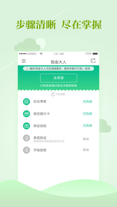 【Pro版用户享有优先审核权!】 【现金大人-年轻人的现金钱包】 无需任何担保和抵押 在线申请,快速放款 让你随时随地马上有钱 【功能特点】 1、资料简单:只需要身份信息和手机号,纯线上操作; 2、极速到款:3步审核,最快5分钟放款; 3、还款便捷:还款提醒服务,APP一键还款。 【团队介绍】 团队集合了外企服务多年的高管人士、国内外著名大学毕业的专业技术人才、以及银行服务多年的资深顾问。 立志将国外先进的金融生活方式引入中国,在国内“普惠金融”起步初期,为社会贡献自己的一份力量。 产品上线同时即获得国内顶级天使投资。此后稳扎稳打,不忘初心。 【联系方式】 有任何问题,请不要犹豫,我们客服妹纸随时欢迎您的咨询。 官方网站:http://www.sdzz.la 微信号 :xianjindarenguanfang 客服电话:4008780213