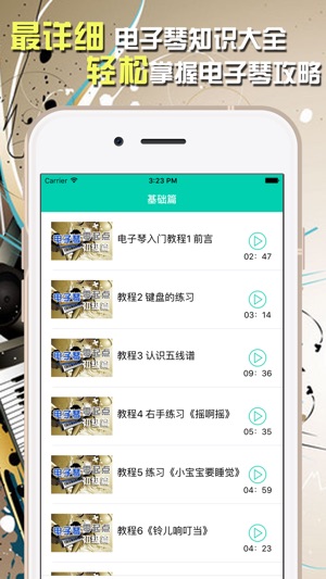 根据初学者的特点,由浅人深,循序渐进图示电子琴入门知识、电子琴视频教程,集乐理、琴谱、电子琴百科于一体,以及必备乐理知识,让初学者认识电子琴的特点,掌握演奏方法,体验电子琴特有的演奏效果! 让一个零基础音乐知识的电子琴爱好者,在饶有趣味的学习中掌握电子琴的演奏技巧,学习弹奏指法,通过教程成长为一个自如演奏初中级乐谱的电子琴爱好者。