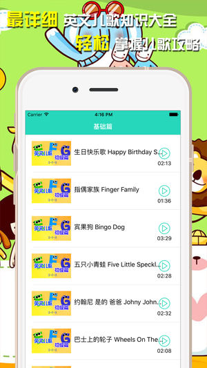 英语儿歌童谣是帮助小朋友学习英语的有效方法。生动有趣的动画,优美动听的旋律,让孩子的英语学习之旅充满乐趣。 伴着悦耳动听的旋律,活泼的童声,为孩子们学唱英文儿歌营造了良好的学习氛围,沉浸在音乐的世界里,让孩子的心灵与音乐共振,心智与音乐共鸣。标准清晰的英语发音,欢欣节奏,在倾听音符的同时,让孩子们在快乐的音乐环境中学习英文,是一份送给孩子们不可多得的礼物。旋律优美动听,悦耳的歌声,欢快的节奏,在欢声笑语中令孩子享受学习英语的乐趣。心听巧学,理性学识,释放潜能,强化启蒙,开启宝宝智慧的金钥匙。 --------------- 【精品儿歌】 《中文儿歌》《舞蹈儿歌》《睡前儿歌》《0…