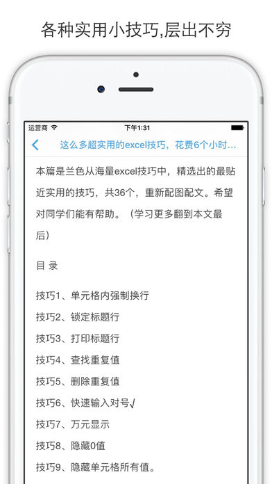 excel大师,教你怎么学excel .最全面的excel公式大全,用简单易懂的表达方式展示给你,让学习枯燥的公式变得简单快乐 .图文并茂展示财务,会计,运营统计报表怎么制作 .支持excel的各种表格主题下载,让你办公变得轻松自然 .每一天学点移动办公知识,让你在以后的职场生涯中变得游刃有余. .你的进度,就是我们最大的快乐.