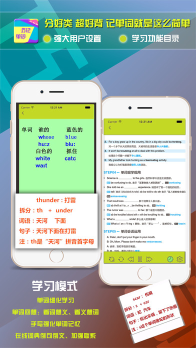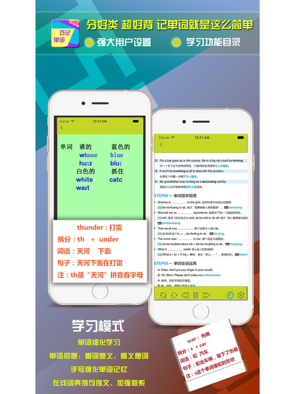 英文是个需要大量记忆的学科。 学习过程如果很长,你永远都学不会。 只有一个办法:竹篮打水。 大量记忆,瞬间灌满; 细水长流,永远灌不满。 短期、密集的单词练习, 对那些记忆力不好的人来说, 是提高英语水平的最好方法。 与众多单词软件的不同之处: 首次推出的、为大量记忆单词作出的设计。 -独创的色彩记忆循环。 -全新的记忆提示。 -提高耐心和专注程度的练习。 -超级有效记单词技巧,记住海量单词No problem!