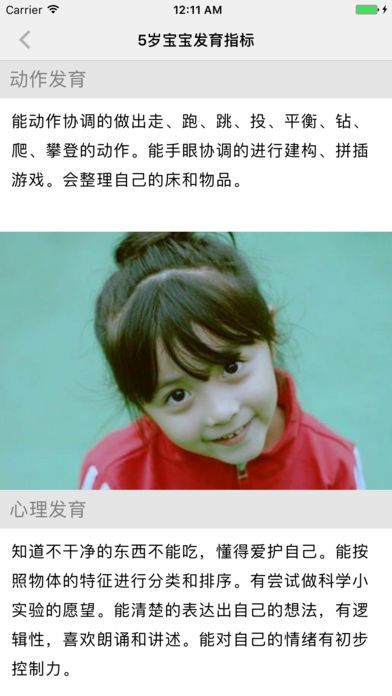 是不是觉得当了爸爸(妈妈)之后,发现很多育儿知识都来不及准备:宝宝发育的是否正常呢?宝宝为什么黄疸偏高呢?宝宝的身高是否超出正常范围呢?什么时候该打疫苗了?这个阶段的宝宝要怎样进行启蒙教育呢?宝宝3岁了,有没有什么适合的亲子游戏进行互动呢?日常生活中有哪些注意事项要规避呢?宝宝这个阶段的智力发育是否正常呢? 从新生儿到7岁儿童成长过程中的好多专业的知识,我们都帮您准备了! 使用iOS原生功能开发,非嵌入网页,操作流畅,界面清新,交互友好。纯绿色无广告。 在这里,您可以得到下面专业知识: 1.宝宝成长发育阶段的身高,体重,头围,胸围,卤门的合理范围数据以及均值; 2.宝宝在各个阶段运动发育,语言发育,感觉发育,身体发育,智力发育指南 3.详细列出宝宝生长发育对照表,比如在1个月的时候的发育对照表如下: 大运动:拉着手腕可以坐起,头可竖直片刻(2秒) 精细动作:触碰手掌,他会紧握拳头 适应能力:眼球会跟红球过中线(稍有移动即可)、听到声音有反应 语言:自己会发出细小声音 社交行为:眼睛跟踪走动的人 4.详细列出宝宝生长发育测评指标,测试方法,测试目的以及通过标准 5.给出适合亲子互动的游戏活动 6.列出详细的教导技巧和生活中常见的温馨提示
