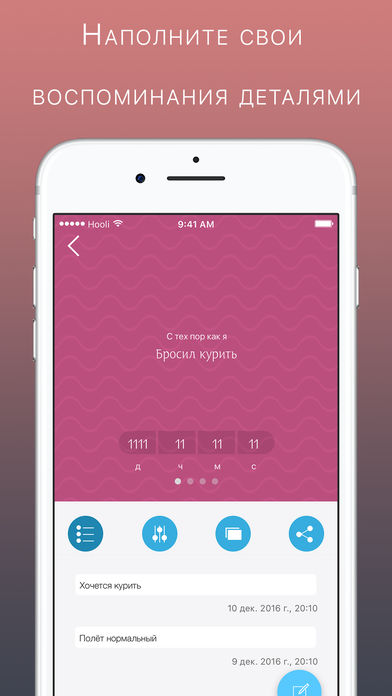 Данное приложение позволит вам никогда не забыть о важных для вас событиях в жизни. Отслеживайте сколько времени прошло с вашего первого свидания, как вы начали заниматься фитнесом, как вы взяли домой котенка, начали отпускать бороду. Бросили курить, сели на диету? Мотивируйте себя, вспоминая как давно вы изменили свою жизнь! Часто откладываете дела на потом и не можете себя организовать? Поставьте себе задачу и следите, сколько времени заняло у вас ее выполнение. Вы можете использовать приложение для таких событий как: Знакомства Свадьба Рождение ребенка Отпуск Переезд в другой город Изменение внешности Бросили курить Открыли свой бизнес Занялись спортом Поставили себе цель
