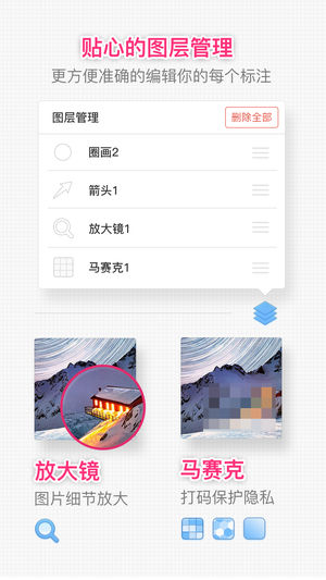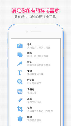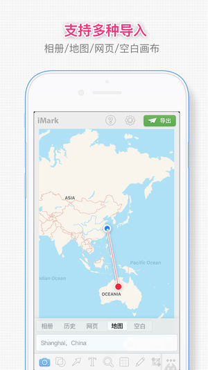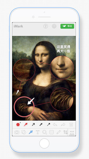 「iMark · 我的标记」是一款简洁易用的图像标记应用,可从相册、地图导入图片,提供多种工具、标记样式,支持标记历史管理、图层管理、裁剪、自定义颜色等进阶功能,丰富的图片导出功能。 · 丰富工具:样式丰富的箭头、线框、画笔、文字、放大镜、聚光灯及马赛克工具 · 全能标记:可从相册、地图或空画布创建标记 · 方便导出:强大的图片导出功能,支持自定义尺寸及社交网络分享 · 强大定制:标记历史记录,标记支持自定义任意颜色、撤销、重做与删除 · 进阶功能:完善的裁剪与图层管理 · 系统扩展:系统图片编辑扩展、3D Touch 主屏快捷方式、iPad 多任务功能