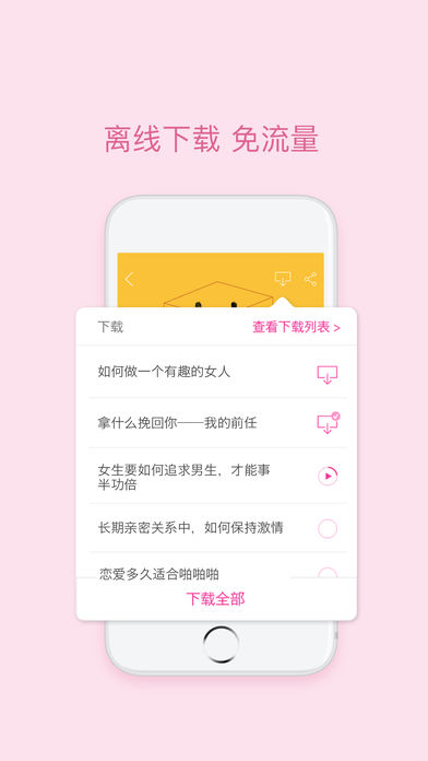 中国首个女性励志产品,以女性的爱情、事业和生活方式为出发点,理解女性在社会转型期中遭遇的情感和道德尴尬,为都市白领提供分享和帮助,成为都市白领女性的闺蜜,真正教你主宰自己的人生,在这里,有100种方式,让男人变得听话,让女人变成女王