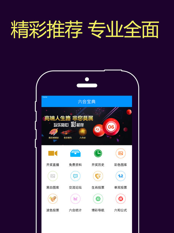 六合宝典是经我们多年研发,以香港六合彩为内容基础,集合了免费资料,开奖历史,统计资讯,全民波色,单双,生肖投票,彩色图库,推荐数据等为一体的六合彩资讯类应用。 六合宝典通过科学计算大量数据,运用了科学分析方法,以图表,文字,统计的方式,计算出最佳的特码, 生肖,波色等玩法。还可在六合宝典应用与所有彩民探讨,查询到六合彩历史的各项开奖数据和分析特点。