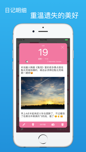 My Diary 我的日记是一款简单易用,功能丰富的个人日记软件。 - 设置自己的头像和名字 - 自动获取天气,并添加图标 - 自动添加地理位置 - 快捷创建日记 - 添加照片 - 加密或者指纹解锁 - 查看日记详细,随时修改 - 更换主题风格 - 更换日记页面背景图片 - 添加紧急联系人 - 日记页面查看所有日记或某一天的日记 - iCloud备份和同步!!!!(妈妈再也不用担心我的数据丢失啦) - 添加属于你的注意事项哦 - 添加你的计划事项 - 一堆注意事項 - 一堆計画事項 - 有些小小的惊喜和涨姿势的东东 - 憋了好久的关于 还有好多新功能正在玩儿命开发中,具体可参考app里面的…