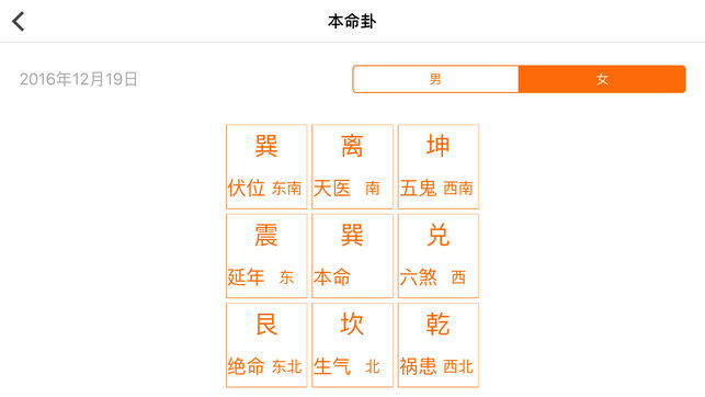 一款快速根据所选日期进行分析本命卦的App。 网上有很多关于查询东四命和西四命的网站,但没有一款App能提供东四命和西四命的快速查询并且生成卦象上方位与吉凶上的关系,本App第一版只提供日期与本命卦的查询,后续会提供各个方位吉凶的具体描述。有助于初学风水的人士快速理解《八宅明镜》中所说东西四命的吉凶方位。