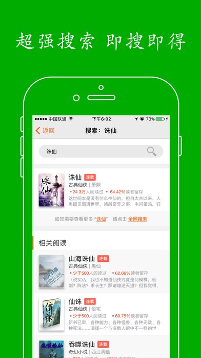 《免费小说大全》是一款小说阅读App,网罗天下经典流行小说,藏书100万+,并对所有书籍做了精准分类:武侠、穿越、科幻、历史、言情、校园、恐怖、科普、人文、教育、技术、经典名著等您能想到的这里应有尽有,并且集成了强大的搜索功能,方便您查找需要的书籍,并能对喜欢的书籍进行下载、收藏、评论......更多功能,欢迎下载体验! 备注:完美支持导入txt电子书!