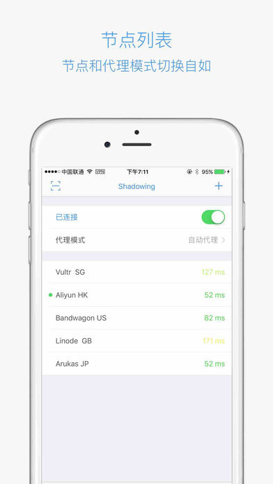 Shadowing is a rule-based proxy utility. It can capture all HTTP/HTTPS/TCP traffic from any applications on your device, and redirect to an proxy server following highly configurable rules,so that it can speed up or filter the network. Features • Scan QR code - QR can be proxy and URL of the rules. • Ping - each node automatically pings six times each time. • Define rules - Import rules from URL, rules list information left slide, you can delete, edit, view the rules information. General users can use the default rules. • View and edit node information - node list information left slide, you can delete, edit, view the proxy information. • Today widget - When add today's widget,start、stop or switch proxy by today's widget. Note: This app has no proxy account,just a utility. ========================================= Shadowing 是一个基于规则的代理工具。 它可以代理手机内所有 HTTP/HTTPS/TCP 流量,并根据自定义的规则转发给代理服务器或直接丢弃,从而达到加速和过滤网络的效果。 特 性: • 支持扫描二维码 - 扫二维码可以支持:代理生成的二维码、规则地址生成的二维码。 • 支持Ping,显示线路延迟 - 为保证准确性,每个节点每次自动 Ping 6次。 • 支持自定义规则 - 可以从URL下载规则。规则列表左滑可以编辑和删除规则。一般用户使用自带的默认规则即可。 • 查看和编辑线路信息 - 线路列表左滑,即可删除、编辑、查看代理线路的信息。 • 今日组件 - 添加今日组件,无需打开App,开启和切换代理。 注意: 此App不自带账号,纯粹的代理工具。必须自行添加账号方可使用。 ========================================= 【自定规则】 一条规则由三个部分组成:类型, 值, 操作 例如:DOMAIN-SUFFIX,cdninstagram.com,Proxy [操作包含]: DIRECT、REJECT、Proxy [含义]: DIRECT: 直接访问 REJECT: 拒绝访问 Proxy: 代理访问 [类型包括]: DOMAIN、DOMAIN-SUFFIX、DOMAIN-KEYWORD、IP-CIDR、GEOIP [含义]: DOMAIN:匹配请求的域名。 例如:DOMAIN,instagram.com,Proxy 匹配instagram.com的域名,走代理。 DOMAIN-SUFFIX:匹配请求的域名后缀。 例如:DOMAIN-SUFFIX,image.instagram.com,Proxy 匹配域名后缀为:image.instagram.com的域名,走代理。 DOMAIN-KEYWORD:匹配域名中包含的关键字。 例如:DOMAIN-KEYWORD, instagram, Proxy 匹配包含 instagram 关键词的域名,走代理。 IP-CIDR:匹配处在给定域内的 IP。 例如 IP-CIDR, 17.0.0.0/8, Proxy 匹配IP域17.0.0.0/8 走代理。 GEOIP: 匹配给定地理区域内的 IP。 例如 GEOIP, CN, DIRECT 匹配中国IP走直连。 [其他规则]: FINAL,Proxy [含义]: 若访问的域名没有匹配的规则,设置走代理。 ========================================= 【部分用户遇到的问题】: Q: 配置无误,但无法联网? [问题分析] 可能没有授权Shadowing 使用网络。 [解决方案]: 1.若第一次安装,可能会遇到 “允许Shadowing使用数据” 的系统提示(iOS10以后需获取用户权限),请点击允许。 2.若不小心点击了‘不允许’,请进入“设置-无线局域网-使用无线局域网与蜂窝移动的应用-Shadowing,允许其“无线局域网与蜂窝移动数据” 即可。然后重启App。 3.若从没有系统提示,请按照方案上面方法2中修改任意一个 App 的蜂窝数据设置,然后再打开 Shadowing 便会弹出系统授权通知,点击允许。 Q: 没有开启Shadowing的情况下,Ping总是超时。 [问题分析] 若您开启了同类软件,Ping是不通的。原因:目前Shadowing的 Ping功能使用系统默认的路由,若您开启了同类软件,会修改了系统的路由,会导致Ping不通。 [解决方案]: 若您使用Shadowing的Ping功能,请关闭其他同类软件。