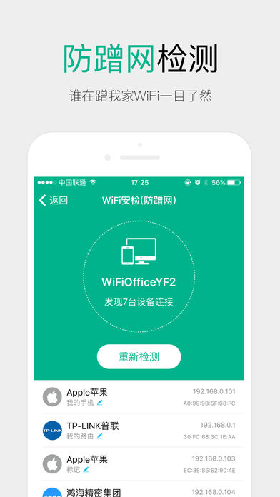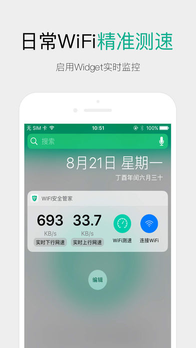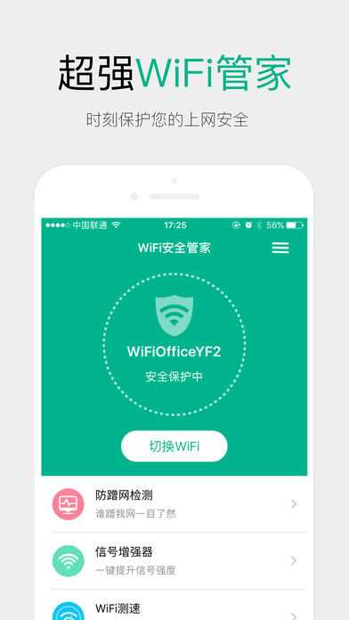WiFi管家基于WiFi伴侣和WiFi钥匙热点库,亿万公共商家热点覆盖全国; 致力于打造WiFi上网极致体验,全面管理WiFi上网各种难题 ——公共商家WiFi一键连接 亿万公共商家热点覆盖全国,随时随地快速上网 通过定位快速匹配附件公共商家热点,点击一键快速连接 ——防蹭网Wi-Fi检测 一键检测连接Wi-Fi的设备,快速标示安全设备 ——日常Wi-Fi精准测速 百兆宽带实际有多快?精准测试网络延迟、下载速度、上传速度 ---------------------------------------- 全新完美支持iOS10各种新特性,各种爽! 打开WiFi管家,一键快速安全上网吧! ----------------------------------------