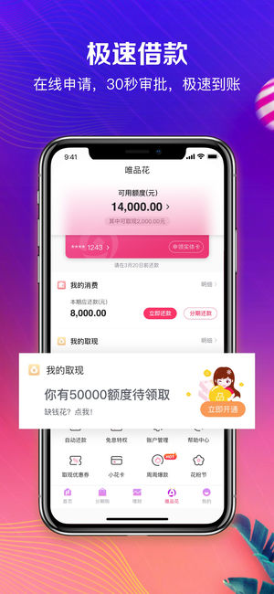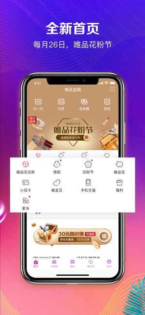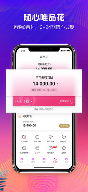 唯品金融官方App,作为一站式金融服务平台,以唯品花消费贷款为明星产品,兼具购物分期、便捷理财、极速借款、保险服务、信用生活、快捷开卡等多种服务于一体,为用户提供多维的金融场景和贴心的金融服务。 •购物分期—唯品花 唯品花是唯品金融推出的消费贷产品。先消费,后还款;0首付,享免息;3-18期随心分期;还款便捷0费心。 •极速借款—唯品花取现 纯线上借款,轻松取现,极速到账。无抵押,门槛低;30秒审批,放款快;3/6/9/12期,随借随还。 •理财神器—唯品宝 唯品宝是唯品金融为个人用户推出的一种余额理财产品。投资便捷,放心理财;灵活赎回,实时到账。 •全心守护—唯品保险 保障量身定制,售后全…
