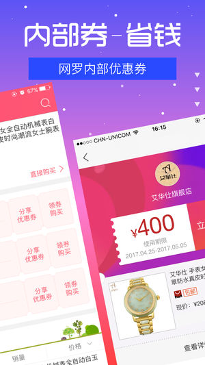 淘宝天猫内部券,免费领取省大钱! 1、想买的宝贝太贵??复制淘宝商品地址到内部券,自动帮你找到优惠券! 2、精选含大额优惠券的优质商品,让你选购更省心! 3、APP内输入关键词搜商品,找到的商品都有券!