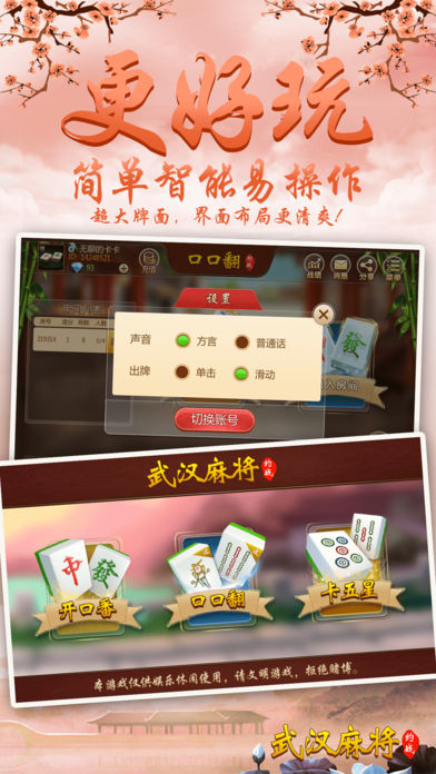 ~~~游戏介绍~~~ 【最刺激】刺激的开口番、口口翻,胡牌爽翻天,更有单独的卡五星玩法哦。 【最稳定】大厂出品,确保游戏过程更加稳定,专心玩游戏,没有掉线卡顿烦恼。 【最好玩】再也不用苦于配桌,全民手机时代,你可以再手机上随时随地和亲朋好友搓麻将,是传统麻将馆的有力补充。和亲朋好友一起开房,决一高下吧! 【最靠谱】可以录像回放,同IP报警,杜绝外挂,真实可靠。 【最智能】智能提示、界面大方更具人性化,支持智能单独、分开支付房费。
