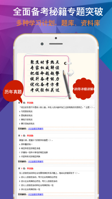 本软件为事业单位考试题库的软件,精心准备了2017年海量试题,适合于2017年(省、市、州、县、乡)事业单位公开招聘工作人员考试,量身为事业单位招聘考试量身打造。 【专项试题内容】 公共基础专项训练包括:时事政治(包括2015年1月~2016年10月及答案含解析)、2016年政府工作报告、2016年中央一号文件、十八大专题、十八届五中全会、十八界四中全会、四个全面、马克思主义哲学原理、毛泽东思想概论、邓小平理论和三个代表、“十三五”规划、重要会议以及重要文件,中国特色社会主义、当代中国政府与政治、中共党史、法律基础知识、法理学与宪法、行政法、民法、刑法、公务员法、商法、经济法、经济知识、政治经济学、科技常识、人文历史常识、事业单位知识、社会公德与职业道德、公文写作与处理、国情与地理、计算机常识等考题。每一章的题型囊括了各地的题型,考点覆盖面广,时效性强,难度适中,解析全面到位,能够最大限度地满足事业单位招聘备考的需求。