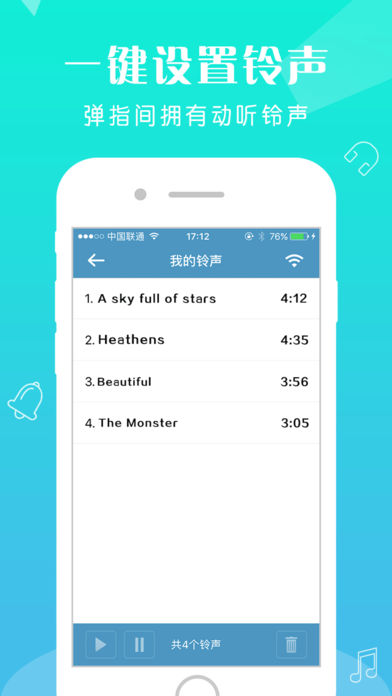 ·iPhone手机换铃声专用软件,千万用户的最佳选择。 ·万首精选铃声,全网最全。独创语音搜铃、文字变铃声功能,实用有个性! 【专注提供高音质好铃声】 【铃声大全】最新最火歌曲铃声,每日更新1000+,同步最热影视铃声、综艺节目铃声,好听铃声多多! 【铃声品质】每首铃声都不低于128kbps,让来电、闹铃、短信铃声更亮更炫,简直是真正的听觉享受! 【铃声制作】支持铃声剪辑、文字变声音,录音可变声,让铃声制作轻松更好玩,最好用的手机铃声管家。 【分类最全】提供多样热门分类任你筛选,中文流行、欧美日韩、DJ舞曲、幽默搞笑、网络神曲、影视金曲、游戏动漫、经典老歌一个都不少!
