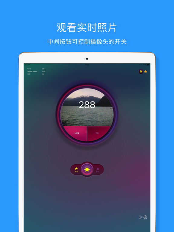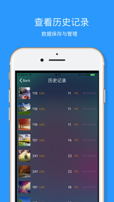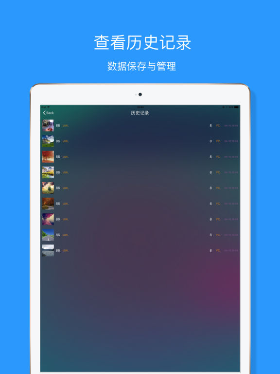 ==最后一天半价!赶快下载吧!== 支持iOS 10! 光照检测器是一款监测记录光照强度的优秀软件。可以用它来检查室内不同时间的光照状况,可以用它调节周围的光线强度,以达到最好的光线环境,可以用它来确定拍照的适当曝光度。这款光照检测器为我们的生活,工作,学习提供全面的光照数值,贴心细致的照顾我们的身心健康,保护我们的眼睛。 特征: — 显示光通量,光照强度,感亮度的数值 — 实时测量,资料精准 — 取适当值,随时查看历史记录值 — 有室内,室外两种模式
