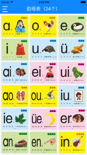 原汁原味有声挂图,把墙上的有声挂图搬到手机上来 生活中的有声挂图,一张都需要12元,值不值?值!因为宝宝学习是无价的,那么手机版的有声挂图来了,而且只需要1元(限时打折中),更加优惠,心动不如行动。 里面包含多种挂图 1 韵母表 3 声母表 3 整体认读音节表 全部是真人发音,声音洪亮,发音标准,难得的好应用。1元只是一支棒棒糖的价钱,在亲子游戏中却能收货知识和家庭的爱,你还没心动吗?