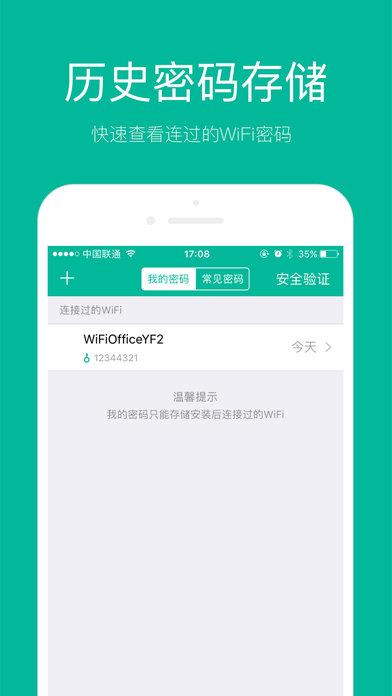 WiFi密码查看器是万能的WiFi密码管理工具苹果版,是白领、学生、商旅人士出行的必备工具。可以帮助用户查看各种公共场所共享的公共WiFi密码;还可以保存用户连接的历史WiFi密码;同时常见密码帮助用户更好地保护自己的密码安全。 附近密码依靠WiFi伴侣和WiFi钥匙的强大数据库支持,拥有全国上亿共享的公共WiFi密码及千万用户支持验证密码的正确性及安全性,为您安全上网保驾护航。 不同于热点连接工具,WiFi密码查看器是一款智能的WiFi密码管家,可以查看附近公共WiFi密码,同时保留历史连接过的Wi-Fi足迹及密码,一键连接WiFi不再是梦想。 ——————我们的特点—————— 附近密码,亿级公共WiFi助您一键智能上网; 历史密码,WiFi足迹快速找到连过的WiFi密码; 常见密码,验证WiFi密码安全性安全上网。
