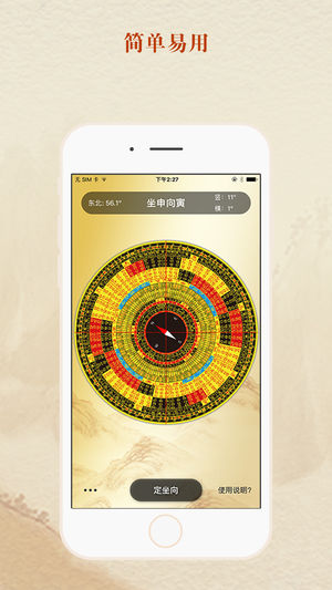 风水罗盘用于立极消砂纳水,它是风水爱好者和专业人士必备的风水工具,此外还为使用者提供专业的罗盘使用说明。 风水罗盘为您提供详尽的专业风水信息,让您在建筑选址、买房、装修时得心应手。 风水罗盘提供以下功能: 1、座向方位和刻度显示; 2、指南针方向定位功能; 3、罗盘可根据您的需要放大与缩小。