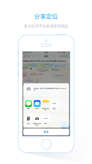 ==最后一天半价!赶快下载吧!== 支持iOS 10! 分享我的位置给朋友,让朋友快速找到我。 最简单的找人软件:逛街,旅游与亲人朋友走丢,与朋友相约见面,一键发送就可以将自己的位置信息告诉朋友了,可以让他们快速找到我 1.打开应用,成功定位我的位置。 2.选择地图模式,普通二位元地图,卫星地图 3.支持多种地图,谷歌,百度,高德,苹果系统自带地图定位 4.多种视图,夜间视图,导航视图,公交视图 5.选择发送的方式:微博,微信,短信等 6.还可以查找附近的公交站牌与附近公交 对方只要点击消息链接,就可以找到我啦。 就是这么简单好友。快来用吧,和好友一起分享找到位置。