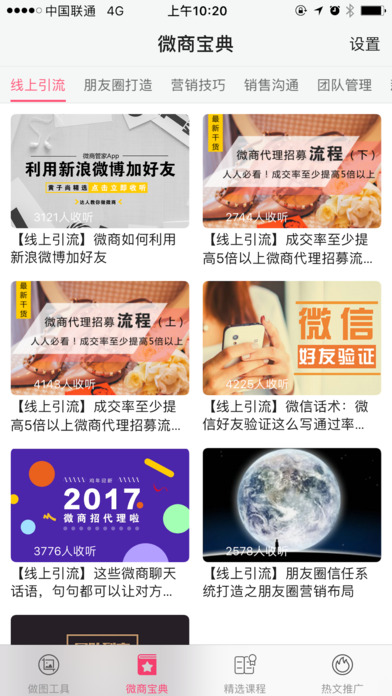 微商-成功都是从这里走出来的。 这里是中国微商的聚集地,每天海量的微商头条资讯,创业大咖的行业干货。 学经验,招代理,引流量,吸粉丝,微商营销之路在这里开启! 功能介绍: [微商宝典]精选微商行业的畅销读物,永不停止学习的脚步。 [微商干货]为微商初级、中级、高级用户提供三种不同等级的干货学习,视频和PPT教学,让你轻轻松松掌握微商技能。 [微商资讯]精选微商行业新闻和热点资讯,让微商从业者随时了解行业动态,站在微商行业的制高点。 更多功能正在开发中,想成为一名成功的微商吗,马上来吧??