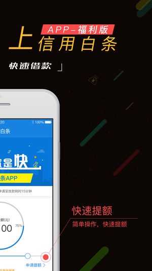 信用白条福利版是一款小额信用贷款、借贷平台,30分钟急速放款,帮您把信用变成现金 1. 信用换现金:副标题让您的信用更值钱 2. 极简流程:三步操作,让借钱更简单 3. 还款便捷:线上还款,方便快捷 4. 手机操作;随时随地都能借款 5. 您的网络信用卡:一次开户,长期享用