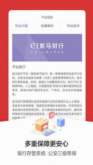 紫马财行6.0全新品牌升级,为您的投资理财保驾护航! 【紫马财行新手大礼包 收益节节高】 注册送100元红包+首次充值送200元红包+新手专属年化12%+2%加息券+参与抽奖100%中奖。 庆紫马财行成立六周年,全场加息,1%-2.5不等。 【应用简介】 紫马财行成立于2015年,已经为近百万用户提供了专业可靠的金融投资服务,累计成交金额近百亿,徽商银行资金存管。作为国内极具成长性的p2p金融产品,紫马财行注重合规建设、可持续发展、提高抵御风险能力,旨在为每一位投资人创造财富增值。 紫马财行总部位于北京,在成都、青岛、延安、淄博等地设有分公司,管理团队由资深金融行业和互联网行业人士组成,均…