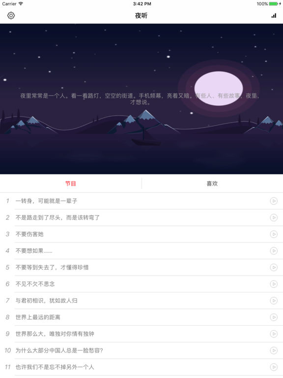 白日的喧嚣隐藏了很多,忙碌、焦虑、莫名的压力,吞噬着我们的生活。 夜听,是一种情绪。 夜听,是一个小小的避风港。 夜听,是孤寂者们的小小扁舟。 在这里,每天夜里,夜听与您道一声晚安。 夜听,让您更加幸福。