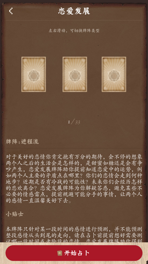 想要获得精准的人生占卜指引吗?需要全新的塔罗占卜给您提供人生的解决方案吗?塔罗牌占卜提供免费的占卜测算服务,全新的84种牌证,为您解决爱情,学习,事业,财运,健康,运程六大方面的问题。 【占卜玩法】22张大阿尔卡拉牌的经典玩法,结合塔罗师精心设计的84种牌阵,每张都图文并茂的为您提供牌义的解释,让您清楚的知晓您在爱情,学习,事业,财运,健康,运程的未来方向,让你更加了解您的过去,现在,未来。 【塔罗占卜】塔罗牌最早出现于15世纪的意大利,它是一种古老的占卜工具,本应用由多位塔罗名师设计精准的测算公式,为你提供84种神秘牌阵。本塔罗牌是现在全球领先专注在塔罗上的免费应用,涵盖了各种流行、实用…