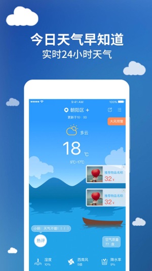 未来7天天气:掌控天气趋势走向,让您的旅行更舒适; 天气预警:当今日当地有预警时,显示有预警按钮,并且给予推送消息,点击则打开预警消息; 天气查询:可随时切换日期查询天气,是你的旅游出行小助手哦 关心消息:可为你关心的人推送消息; 实时天气:实时更新天气情况,时刻提醒你最新的天气变化,打造全新天气体验; 广告推荐:根据天气的变化实时推送你所需要的商品;