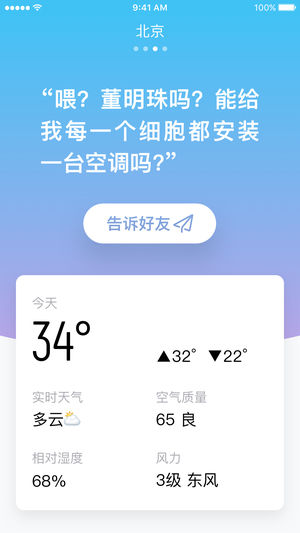 嘿,我是小明,首个“人工智能”超级天气App。 天气好能带你出去浪,不好能提醒你早预防; 我不会宽慰你天气还不错,只会告诉你今天有多热; -未来24小时天气预测 上班、约会、旅行、聚会,哪样都不耽误你; -未来7天天气预测 该不该洗车?订不订飞机?统统告诉你; -用气象学知识武装你 谈天说地更教你天气原理,聊天气也能装逼; -东边日出西边雨 准确预测同一个城市不同区域的天气; -精准灾难性预警 洪涝、台风、冰雹、大暴雨,同步国家气象局; -关注亲朋好友所在城市天气 一键分享,提醒好友天气情况 我是小明,最智能天气APP,等你来撩!