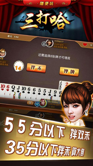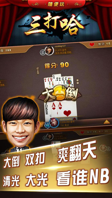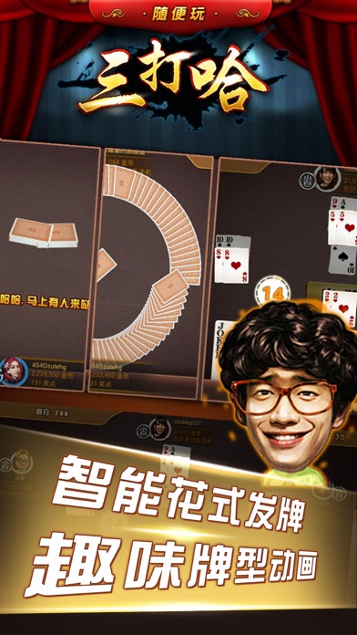“三打哈”扑克牌游戏起源于湖南,现逐步流传到全国各地,有的地方叫“三打一”,其打法类似升级和拖拉机。 “三打哈”具有华美的画面,有趣的音效,在手机上完美重现了三打哈游戏,随时随地随便玩。 “三打哈”使用先进引擎技术开发,运行流畅,手机、平板都能玩。 --------------------------------------------- 快速游戏:独特玩家撮合机制,万人在线,随时不缺人的极速游戏 永久免费:免费下载、免费游戏,超多免费任务、活动随便玩 最最真实的玩牌体验,考研技术与配合的技巧 省电省流量:全面优化,超省流量,省钱省心 超大牌面:粗指头姑娘、汉子也不怕点错牌 精美画面:打牌也要视觉享受,精心配色,好看不伤眼 特色音效:诙谐有趣,只求博您一笑 超多任务:特殊日、节假日、新手、升级、大胜……超多任务福利、金币随便送,让您领到手抽筋!