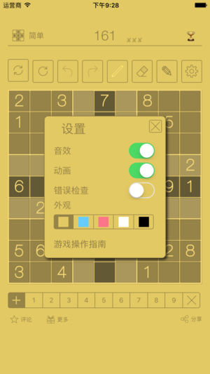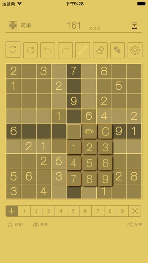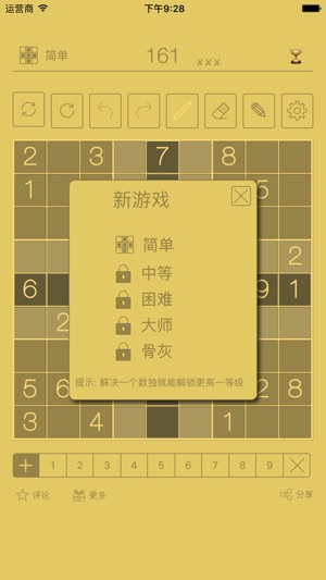 无数的数独谜题等待着智慧的您。 每解决一个数独谜题就能获得积分,提升您在世界数独排行榜中的名次。 独一无二的土豪金界面让您获得非与伦比的尊贵享受! 1)无穷的谜题,绝不雷同! 2)简单级到骨灰级,总有适合您的! 3)实用丰富的解题工具,摆脱乏味,增添乐趣! 4)多种界面风格,适合独特的您!