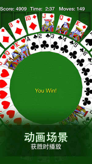 新特色:我们创建了新款“假日主体包”为您的纸牌游戏增添一份乐趣!您可以将纸牌游戏外观更改为万圣节、冬日奇境或情人节的主题。 我们一直努力保持经典纸牌游戏的原汁原味。您每天都会接到一个特殊的“每日挑战”任务。只要您完成了“每日挑战”,您就能获得当天的皇冠一枚。每月多多赢取皇冠,可以获得奖杯哦! 好久没赢一回了?选择有解回合!您可以对游戏进行设置,从而确保您手中的牌至少拥有一种获胜的方案。还是不知道如何获胜?“显示如何获胜”这个功能将引导您一步步获得胜利。 您的牌技是否天下无敌?打开苹果游戏中心,您就可以查看游戏中心的排行榜,一览您与天下高手之间的排行了! 荣登苹果2010年的最佳榜单。M…