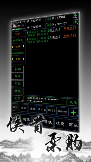 这是MUD(Multiple User Dungeon的简称),这是从互联网创始起就风靡全球的游戏模式,如今,它在手机上复生了! 这是一个颠覆性的游戏玩法,引领你进入无比宏大的武侠世界、无数惊世的武林绝学、无数玩家共同在线的全民网游。将带给你全新体验的纯文字的战斗乐趣,充满无限想象空间的战斗过程! 在游戏中,你可以根据主线任务逐步提升自己的各项属性,挑战各个名门大派,或扬善惩恶,或暗影独行,数百种技能供你选择,数百块地图任你探索,数百个电脑人物与你交互...有战斗、有任务、有探险、有谜题、还有陪伴你的红颜知己...江山美女,任你指点。 下载它!打开它!在一个由数十万字谱写的武侠世界中,创…