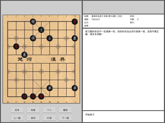 象棋杀法练习提供免费版,欢迎下载。 象棋杀法是棋手对弈过程中的基本功,是象棋高级技战术的基础。它包含着对弈者的智慧,体现出无穷的艺术魅力,更包含着象棋攻防的规律。 象棋杀法练习共收入了各类杀法计2217道练习题,分为初级、中级和高级,初级为一步杀到四步杀的1600道题,中级536道题,高级81道题。如果坚持把这些题全部做完,杀棋能力将明显提高,用棋界 的行话来说,差不多可提高一马的功力,甚至更多。