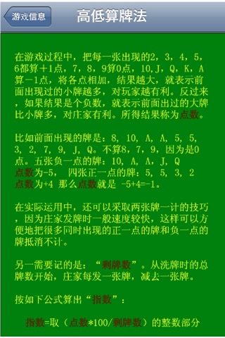 此游戏你熟练掌握二十一点高低算牌法。 此游戏很容易玩: 变换赌注额:点击钱币 开始赌:将钱币往上推 要牌:点击牌的下部 不要牌:在牌的下部从左至右划一下 加倍:将钱币往上推 分牌:将第二张牌向右划一下 保险:将左边钱币往上推 因为此游戏不用按键,使其更为逼真,如身领其境在赌城. 由算牌得到的指数决定赌注额。大西洋赌城或拉斯维加斯赌城战略决定:要牌,不要牌,加倍,或分牌。你可以改变游戏设制得到提示。当你玩此游戏,你的赌法不符合你选的战略,你将得到战略提示. 当你选的赌注额不符合算牌得到的赌注额,你将得到算牌提示。 点击右上方i 图标, 将得到更多的信息. 此游戏列出高低算牌法,战略图表供你随时查阅.游戏信息部分还包括其它有用资料供你参考. 正在玩二十一点的朋友:当你熟练掌握大西洋赌城或拉斯维加斯赌城战略,你可以开始玩二十一点算牌。