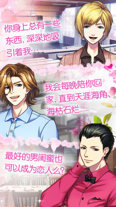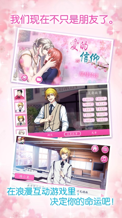一个有信任危机的人要怎么打开心扉?当你身上有其他重任时,还会冒险坠入爱河吗? ===我们向你强烈推荐,如果你……=== *热爱电影,电视剧和言情小说 *希望跟一名帅气男生谈恋爱 *想在APP上享受风花雪月 *对言情游戏或乙女游戏感兴趣 *喜欢少女漫画或动画 *喜欢浪漫爱情剧 *想感受爱情的紧张 *对校园恋情充满好奇 *想看一个人物关系复杂的故事 *想读一些让你心神荡漾的甜言蜜语 *对日系风无抵抗力 ===故事梗概=== 你意志坚定而且细心体贴,可是又出奇的独立,对身边的人不信任。 上学第一天,你在校园里遇到了几个性格各异的男生。当你对他们熟悉起来,你发现他们的独特来自一些无法言说的原因。你会怎么做?改变自己的想法,接近他们,甚至有可能坠入爱河?还是默默地继续留在自己的安乐世界? ===角色介绍=== 井上一哉 身材苗条,但很健康,有型的金发和绿色的眼睛。他性格外向,在学校里备受欢迎,但是个刚愎自用的人。 本田代助 身材魁梧健壮,留着短短的黑发,让人敬而远之。他是一名百货商店员工,其含蓄、坚忍和聪明的性格非常吸引你。 水岛由真 一头褐色的卷髪,黑色的眼睛,脸上带着大大的微笑。他是瘦高个儿,最重要的是他的笑容很有杀伤力。 小长广田 “嗨……又是你啊!这就是缘分吧?” 生活中有些事真的令我抓狂,而他好像就做到了其中之一。呃,一个如此粗鲁的男生还有这么好的身材,老天真不公平。他就是浪漫又潇洒。 ===游戏玩法=== -打开APP -播放开场白 -选择你喜欢的角色 -选择接近你喜欢的男生 -输入你的邮箱地址,接收来自你选择的男生的消息 -给我们反馈,有任何意见或疑问,通过游戏联系我们 ===特点=== 1)双向结局--每个角色都有两个不同的结局。故事发展由你的选择决定! 2)体验办公室恋情--挑选一个好男人做同事,尝试一下成熟的约会。 3)公开的秘密--发现神秘部门里的不和谐声音存在的深层原因。 ===支持=== 联系我们前,请查看FAQ。如果您仍需帮助,请点击APP里的“联系我们”按钮或本页的“APP支持”按钮。请注意我们无法回应APP商城的评价或Facebook发布的留言。 ===关于Ice Queen Media=== Ice Queen Media旨在为享受恋爱中的日常小事的玩家们提供高品质的模拟恋爱互动游戏。我们有各种不同的可视小说,玩家们可以自主选择自己的恋爱历程! ===重要信息=== 安卓4.0或更新版本