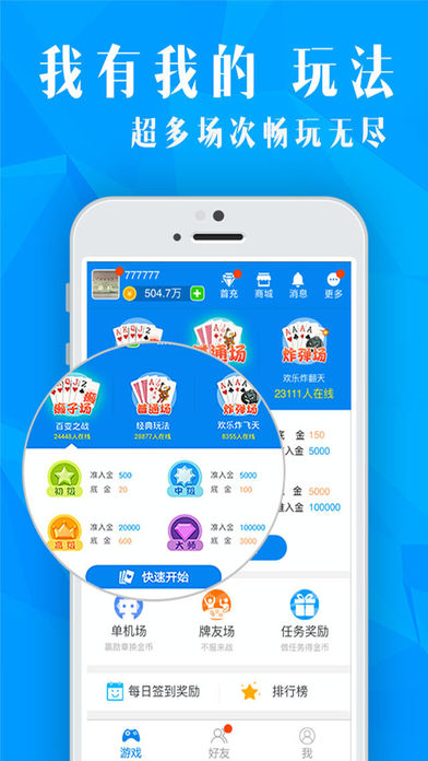 独“竖一帜” ,竖屏-单手操作! 唯我应用风,清爽-久战不乏! 好友随时约,高手-不再寂寞! 省流量,玩法多,经典、癞子、炸弹,一样不缺! 社交棋牌新玩法,打造史上最壕斗地主! 让玩家单手就能轻松享受竞技游戏快感!游戏多重精彩玩法完美呈现:最纯正的经典玩法,最刺激的百变癞子玩法,还有随时随地对战,零流量消耗的超炫单机玩法,都能让你乐享其中!