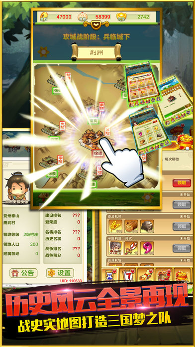 欢迎大家加入官方QQ群:374771657 回到三国做领主: 升级建筑、指派工人、打造装备、武装军团、寻访名将!你能想到的,《主公打天下》里都能拥有,平灭匪患、攻城掠地,征服其他玩家天天向您进贡!一键轻松征战、睡觉挂机生产、半价抢购军备、霸气调教历史名将,还有小婵妹妹天天陪你玩哦~ 【特色玩法】 1.掠地:挑战其他玩家,掠夺地盘和财富, 2.攻城:攻城是以家族为单位,当家族达到5级后,族长便可以选择一座城池作为目标,发动攻城战役,整个步骤分为宣战-出征-开战-决胜。 3.平匪:组织部队小试牛刀,消灭领地附近的山贼收缴物资,获得武将升级道具和金币赏金。 4.演武:与同等级领地的其他玩家进行无损失的模拟对战,逐渐熟悉士兵与武将的搭配。胜利后获得勋章,兑换高级武将、稀有道具。