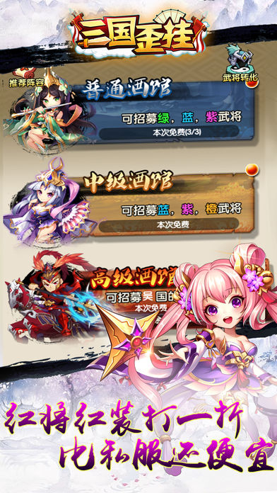 不一样的挂机游戏,不一样的三国故事,【三国歪挂】,一款与众不同的三国类放置挂机游戏,带您踏上一段无限荣耀的三国演义武侠征程。 在这里,三国名将,曹操,关羽,孙策,吕布任您调遣! 在这里,魏,蜀,吴,群雄,四方阵营,任您加入! 组建一支属于自己的军队,穿戴齐一身无坚不摧的装备, 走一走,看荀彧是否像传说一般雄姿英发! 转一转,睹周瑜是否如想象一般羽扇纶巾! 沙场上,各路诸侯,各方玩家列阵以待,5分钟上手,10分钟竞技,1小时您就可以割据一方,谱写自己的不败神话! 沙场上,华佗救死,郭嘉扶伤,吕蒙陆逊携手,发出绝技“烈火轰雷”,给予敌人一击必杀! 军营内,我方英雄合纵连横! 战场边,各路玩家挥斥方遒! 【产品特点】 特点一:放置挂机玩法,好玩不累 特点二:武侠弟子收集,玩法独特 特点三:神兵利器装备,称霸武林 我们有高还原度的三国英雄,我们有基于历史的四方阵营,我们有兵法大家的奇门遁甲,推理演算,我们有战火连天的燃烧远征,沙场驰骋,有脑,您可以指点江山,领兵杀敌,无脑,您可以静坐挂机,谈笑风生! 挂机三国玩家QQ群: 477451146