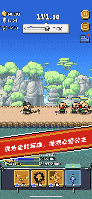 全能英雄是由柠檬酱工作室和Jampot联合出品的新游戏,半放置玩法+横版像素闯关+角色养成让你完成一个屌丝逆袭的奋斗成就。 【故事概述】 男主喜欢的公主被大魔王抓走,手持破铁剑的男主毅然出发解救公主!一路上过关斩妖,收集材料,合成装备,练就各种技能,击败无数Boss,最终成为一个全能型英雄,成功营救公主并走上人生巅峰。 【游戏玩法】 半放置的战斗操作方式,玩家要掌控技能的释放时机,合理使用道具通过一个个关卡。 任务系统,装备制作工坊,人物和技能升级让营救之路事半功倍。 【游戏特色】 经典的像素风格 丰富的养成系统 创新的半放置玩法 有趣的装备品阶系统 上百个关卡和极具挑战性的Bos…